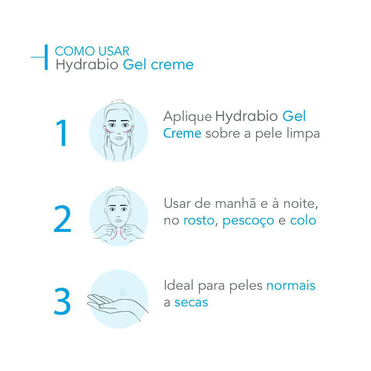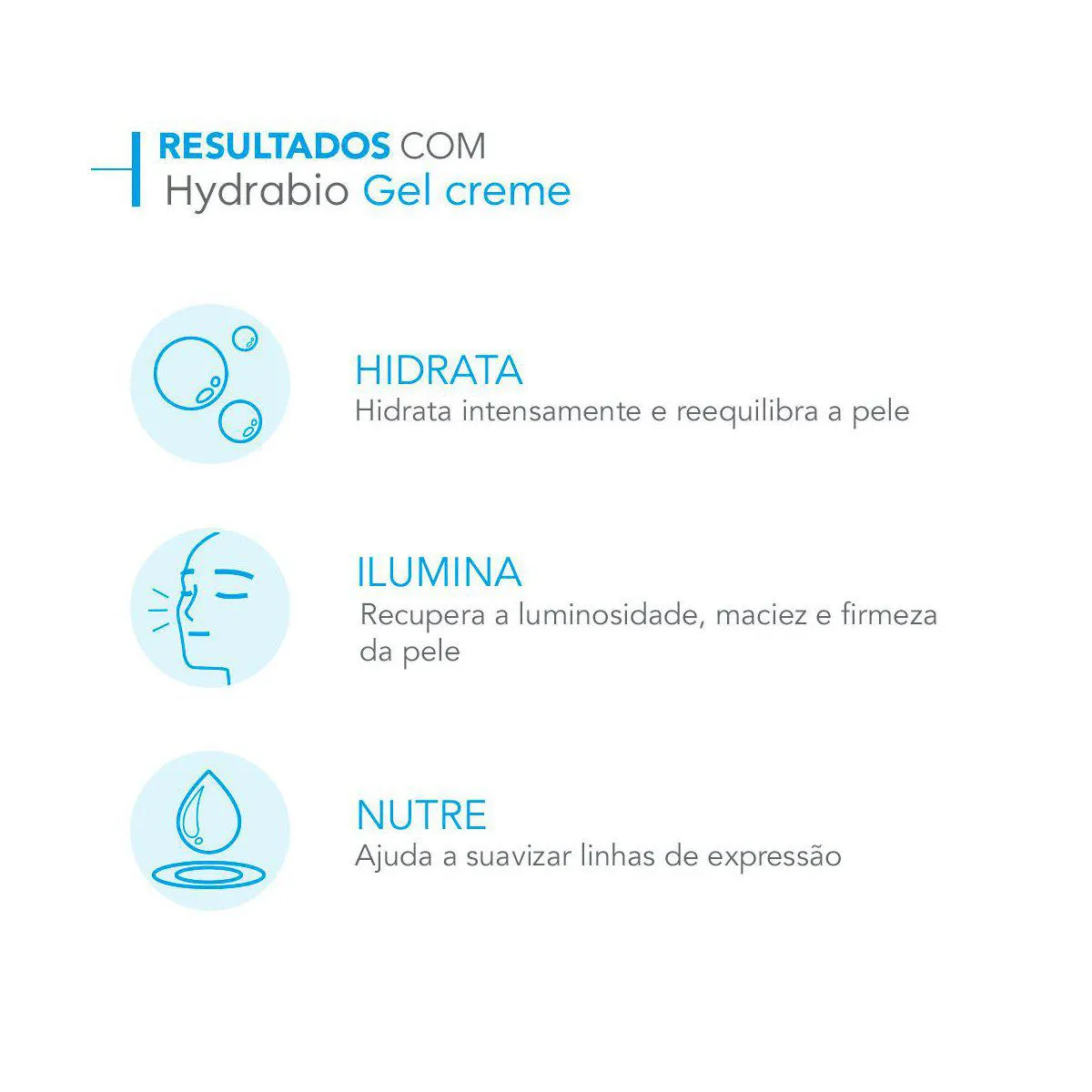 Com sua ação suavizante em textura gel-creme leve de rápida absorção, Hydrabio Gel Creme hidrata intensamente e melhora a luminosidade da pele, recuperando a maciez e firmeza e ajudando a suavizar a textura da pele e aparência de linhas de expressão.